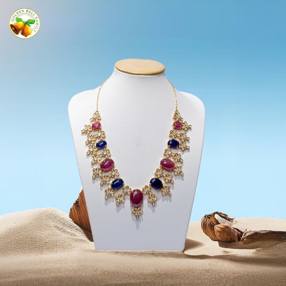 တောက်ပသော ပန်းရင့်ရောင် သဘာဝ Rubellite Tourmaline များနှင့် နက်မှောင်တည်ငြိမ်သော နီလာ (Blue Sapphire) ကျောက်မျက်ရတနာများကို စိန်ပွင့်များဖြင့် ရံကာ 24K ရွှေစင်ရွှေသားပေါ်တွင် အနုစိတ်စီခြယ်ထားသော High Jewellery ဆွဲကြိုးဖြစ်ပါသည်။ ပန်းပွင့်ပုံသဏ္ဌာန် စိန်စီလက်ရာများအကြား ကျောက်မျက်များကို တစ်လှည့်စီ နေရာချထားသည့် ဤဒီဇိုင်းသည် ဝတ်ဆင်သူအား ခေတ်မီဆန်းသစ်ပြီး ထည်ဝါစူးရှသော အရှိန်အဝါကို ပေးစွမ်းနိုင်ပါသည်။ အထူးပွဲတက် အခမ်းအနားကြီးများနှင့် ဂုဏ်သရေရှိ လူမှုရေးပွဲများတွင် လူကြီးမင်းတို့၏ ဂုဏ်သိက္ခာကို အထူးပေါ်လွင်စေမည့် တန်ဖိုးကြီး လက်ရာမွန် ရတနာတစ်လက် ဖြစ်ပါသည်။